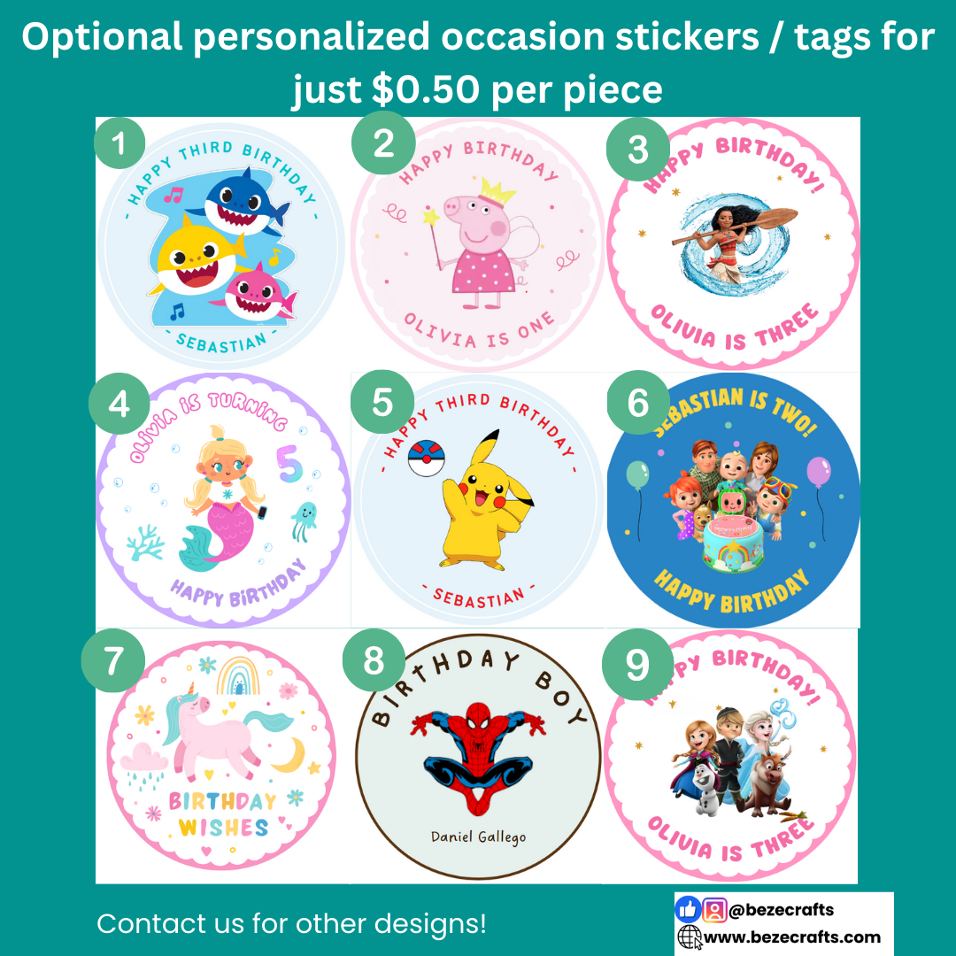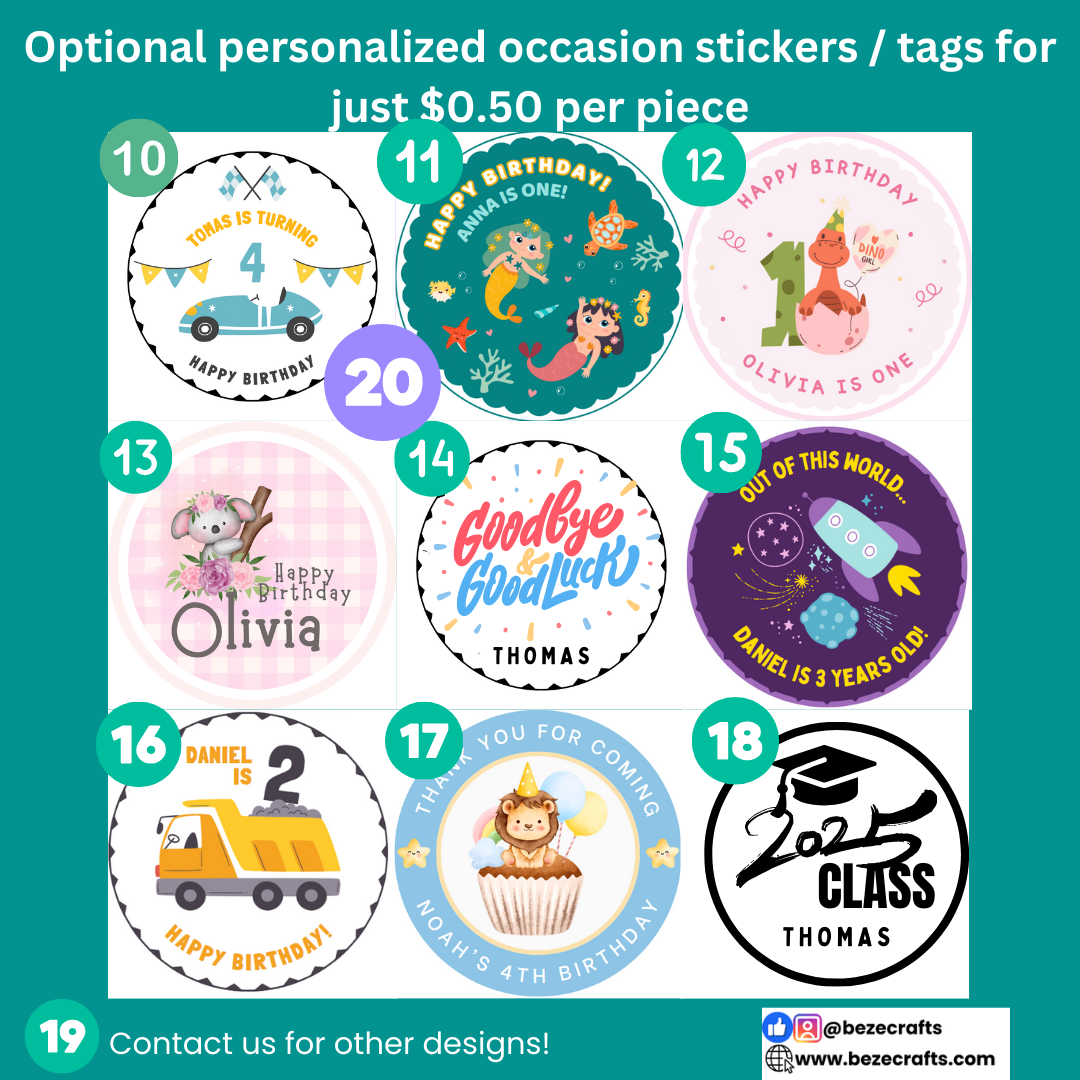 Enhance your goodie bags with optional personalized occasion stickers for just $0.50 per piece.